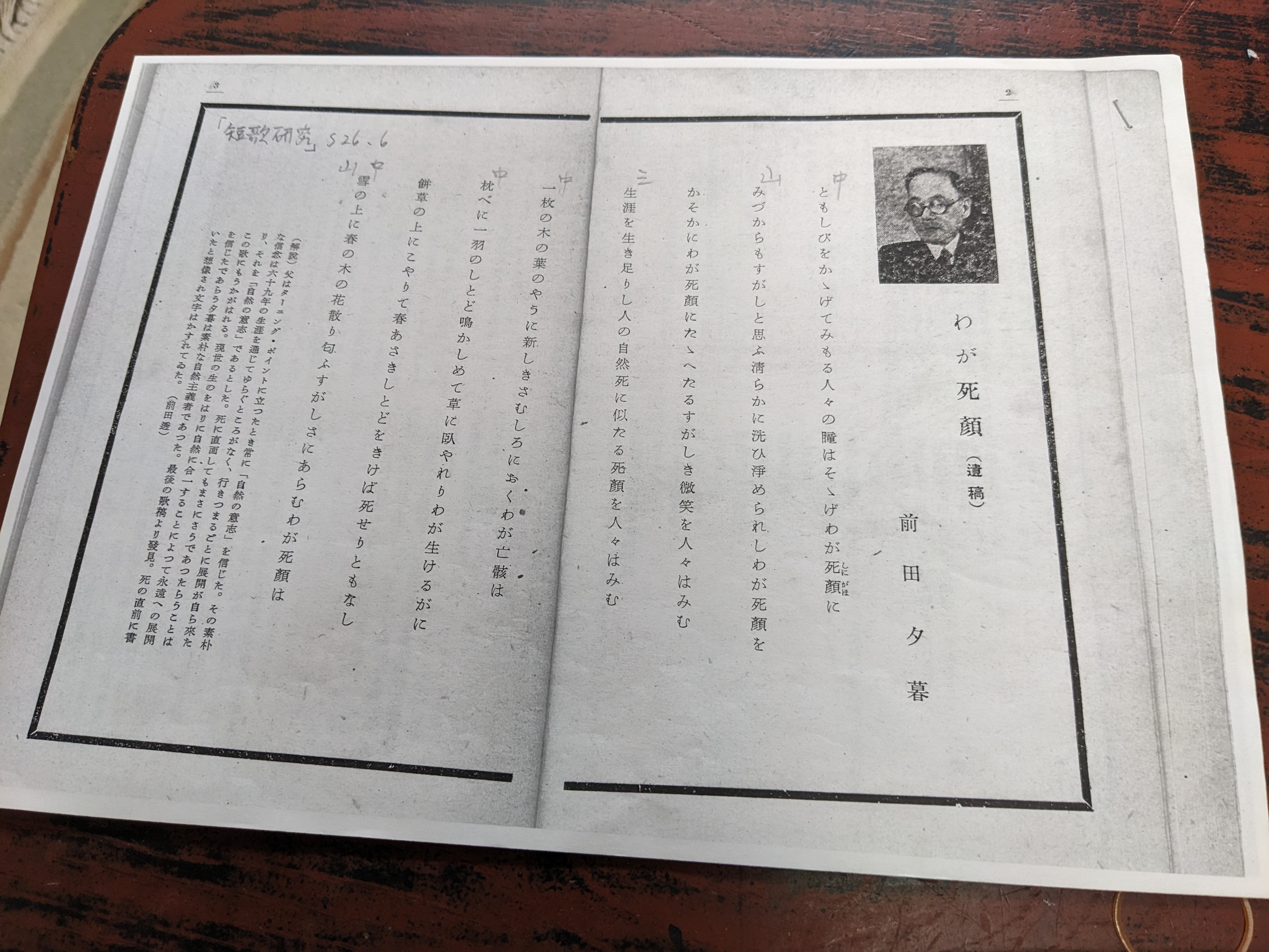 晩年の夕暮の歌集、定型に戻ってからの歌集『耕土』、続く同時期の『埴土地帯』、没後の『前田夕暮遺歌集』などから、遺詠十首が、突然、詠い出されたものではなく詠われるべく詠われた歌境であったことをその歌から辿ってみたいと思います。